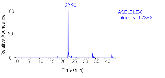 Experiment Description: 1 million cells from cell line K526 were lysed in an immuno-precipitation buffer containing 20 mM Tris-HCL (pH 7.6), 150 mM NaCl, 1mN EDTA, 0.1% NP-40, 100ug/ml PMSF, and 1mM sodium vanadate. Cell lysates were vortexed on ice for 30 minutes and spun to clear. The Supernatant was then incubated with protein A, and then with ABL1 specific antibody that has already been bound to protein A. Samples were incubated overnight, washed and then the beads were boiled in gel loading buffer and run for 1 hour on an SDS page gel (12% Bis-Tris). Resulting gel bands were then excised, reduced, alkylated and digested overnight with trypsin.