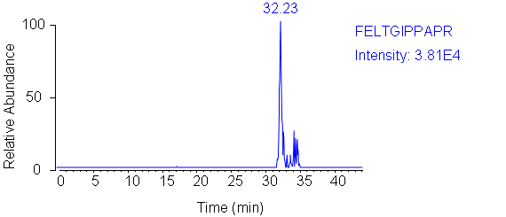 Experiment Description: Cells from HCT116 were lysed in 8M urea/ 100mM ammonium bicarbonate buffer on ice. The equivalent of 100,000 cells were loaded onto a SDS gel. The protein of interest was excised and ingel digestion with trypsin was performed after reduction and alkylation with TCEP and IAA. 1/4 of the resulting digest was then analyzed on a Thermo Scientific TSQ mass spectrometer.
