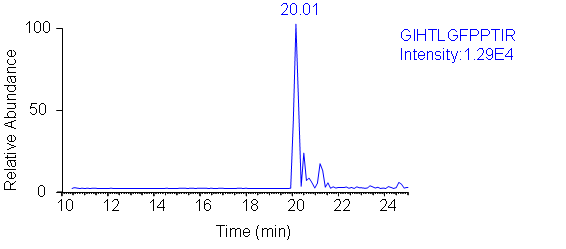 Experiment Description: Cells from HT29 colon cancer cells were lysed in 8M urea/ 100mM ammonium bicarbonate buffer on ice. The equivalent of 100,000 cells were loaded onto a SDS gel. The protein of interest was excised and ingel digestion with trypsin was performed after reduction and alkylation with TCEP and IAA. 1/4 of the resulting digest was then analyzed on a Thermo Scientific TSQ mass spectrometer.