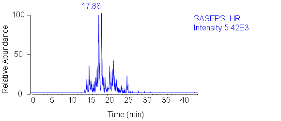 Experiment Description: Cells from the Melanoma cancer cell line were lysed in RIPA buffer. The equivalent of 200,000 cells were loaded onto an SDS gel. The protein of interest was excised and ingel digestion with trypsin was performed after reduction and alkylation with TCEP and IAA. 1/6 of the resulting digest was then analyzed on a Thermo Scientific TSQ mass spectrometer.