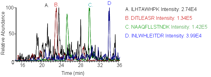 Peptides screening: Peptides and transitions for analysis were selected using a predictive peptide program. The results were screened for those with the highest specificity and the most intense transitions.