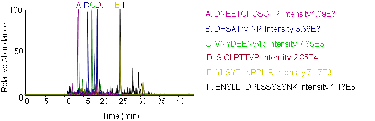 Peptides screening: Peptides were chosen in Skyline with preference given to tryptic sequences observed in the NIST Human LC-MS/MS library; for such peptides, the 5 most abundant y ions were automatically chosen. Additional peptides were chosen with preference given to sequences between 8 - 15 amino acids long, with no missed cleavages, and with no methionines. Fragment ions were chosen to represent the largest y ions, with attention to the presence of P, D, E, and H residues in the sequence.