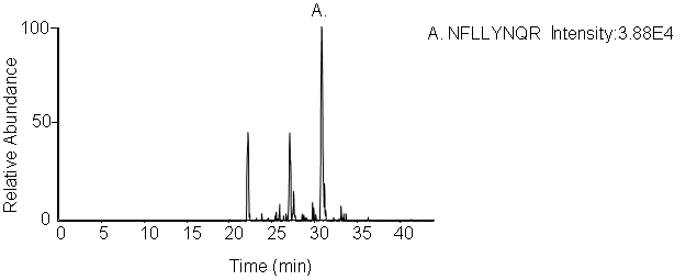 Peptides screening: Peptides and transitions for analysis were selected using a predictive peptide program. The results were screened for those with the highest specificity and the most intense transitions.