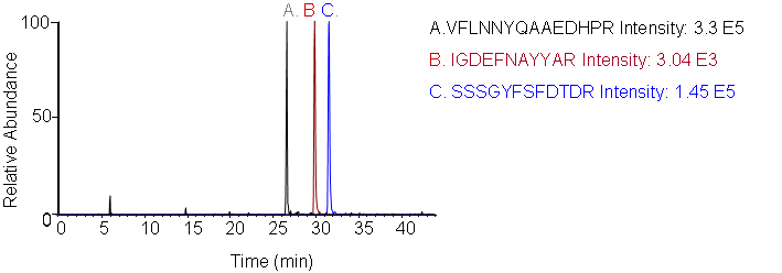 Peptides screening: Peptides and transitions for analysis were selected using both LC-MS/MS data and a predictive peptide program. The results were screened for those with the highest specificity and the most intense transitions.