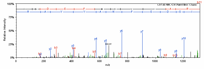 Sample Preparation: Cells from line 8226 were lysed in RIPA buffer. The equivalent of 50,000 cells were loaded onto an SDS gel. The protein of interest was excised and ingel digestion with trypsin was performed after reduction and alkylation with TCEP and IAA. 1/4 of the resulting digest was then analyzed on a Thermo Scientific TSQ mass spectrometer.