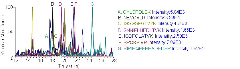 Peptides screening: Peptides and transitions for analysis were selected using a predictive peptide program. The results were screened for those with the highest specificity and the most intense transitions.