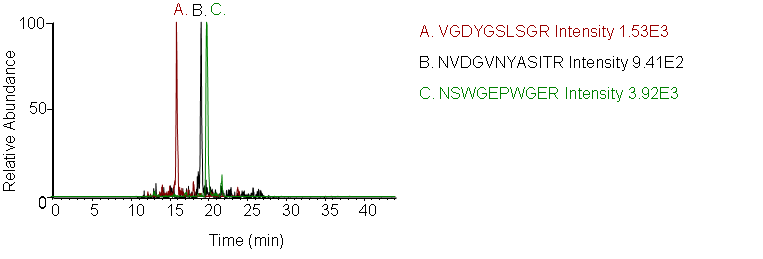 Peptides screening: Peptides were chosen in Skyline with preference given to tryptic sequences observed in the NIST Human LC-MS/MS library; for such peptides, the 5 most abundant y ions were automatically chosen. Additional peptides were chosen with preference given to sequences between 8 - 15 amino acids long, with no missed cleavages, and with no methionines. Fragment ions were chosen to represent the largest y ions, with attention to the presence of P, D, E, and H residues in the sequence.