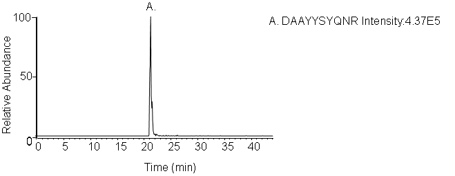 Peptides screening: Peptides and transitions for analysis were selected using a predictive peptide program. The results were screened for those with the highest specificity and the most intense transitions.