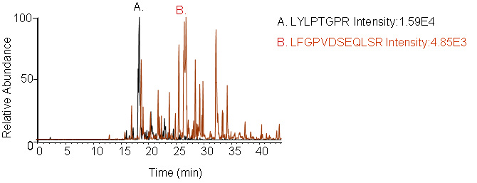 Peptides screening: Peptides and transitions for analysis were selected using a predictive peptide program. The results were screened for those with the highest specificity and the most intense transitions.
