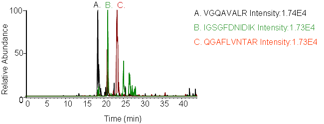 Peptides screening: Peptides and transitions for analysis were selected using a predictive peptide program. The results were screened for those with the highest specificity and the most intense transitions.