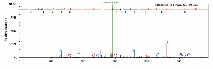 Sample Preparation: Cells from colon caner line HCT 116 were lysed in 8M urea/ 100mM ammonium bicarbonate buffer on ice. The equivalent of 60,000 cells were loaded onto a SDS gel. The protein of interest was excised and ingel digestion with trypsin was performed after reduction and alkylation with TCEP and IAA. 1/6 of the resulting digest was then analyzed on a Thermo Scientific TSQ mass spectrometer.