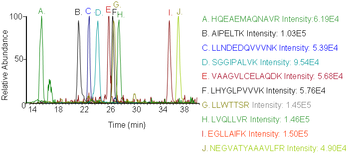 Peptides screening: Peptides and transitions for analysis were selected using a predictive peptide program. The results were screened for those with the highest specificity and the most intense transitions.