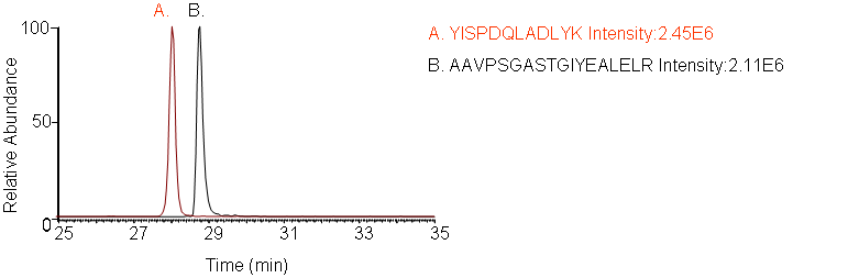 Peptides screening: Peptides and transitions for analysis were selected using a predictive peptide program. The results were screened for those with the highest specificity and the most intense transitions.