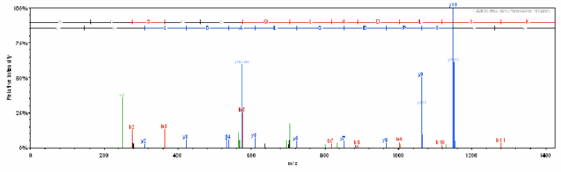 Sample Preparation: Cells from HCT116 were lysed in 8M urea/ 100mM ammonium bicarbonate buffer on ice. The equivalent of 100,000 cells were loaded onto a SDS gel. The protein of interest was excised and ingel digestion with trypsin was performed after reduction and alkylation with TCEP and IAA. 1/4 of the resulting digest was then analyzed on a Thermo Scientific TSQ mass spectrometer.