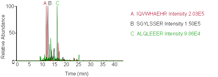 Sample Preparation: Control urine was processed via ultrafiltration according to Moffitt Proteomics protocol and subjected to in-solution digestion with trypsin, following thermal denaturation, reduction, and alkylation. Peptides were chosen in Skyline with preference given to tryptic sequences observed in the NIST Human LC-MS/MS library; for such peptides, the 5 most abundant y ions were automatically chosen. Additional peptides were chosen with preference given to sequences between 8 - 15 amino acids long, with no missed cleavages, and with no methionines. Fragment ions were chosen to represent the largest y ions, with attention to the presence of P, D, E, and H residues in the sequence.