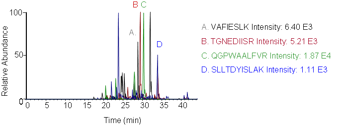 Peptides screening: Peptides and transitions for analysis were selected using a predictive peptide program. The results were screened for those with the highest specificity and the most intense transitions.