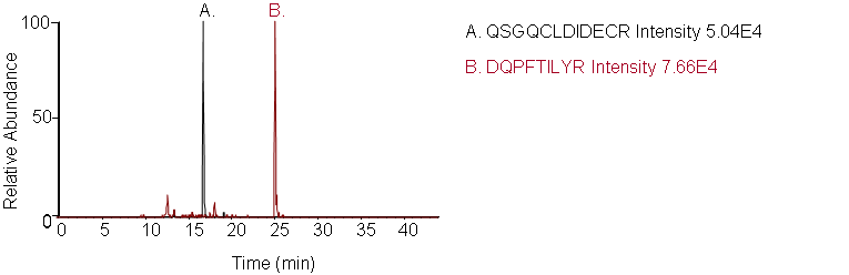 Peptides screening: Peptides were chosen in Skyline with preference given to tryptic sequences observed in the NIST Human LC-MS/MS library; for such peptides, the 5 most abundant y ions were automatically chosen. Additional peptides were chosen with preference given to sequences between 8 - 15 amino acids long, with no missed cleavages, and with no methionines. Fragment ions were chosen to represent the largest y ions, with attention to the presence of P, D, E, and H residues in the sequence.