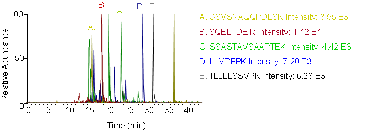 Peptides screening: Peptides and transitions for analysis were selected using a predictive peptide program. The results were screened for those with the highest specificity and the most intense transitions.