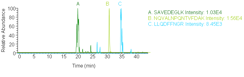 Peptides screening: Peptides and transitions for analysis were selected using a predictive peptide program. The results were screened for those with the highest specificity and the most intense transitions.
