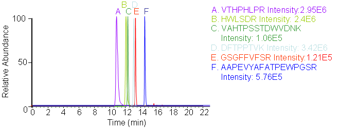 Peptides screening: Peptides and transitions for analysis were selected using SRM builder, a peptide predictive program. The results were screened for those with the highest specificity and the most intense transitions.