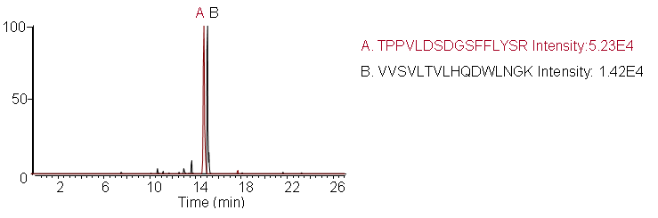Sample Preparation: Human Serum was digested overnight with trypsin after reduction and alkylation with TCEP and IAA. Sample was then diluted 1:10 for analysis on a Thermo Scientific TSQ mass spectrometer