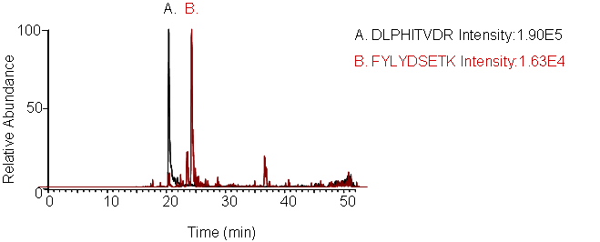 Peptides screening: Peptides and transitions for analysis were selected using a predictive peptide program. The results were screened for those with the highest specificity and the most intense transitions.