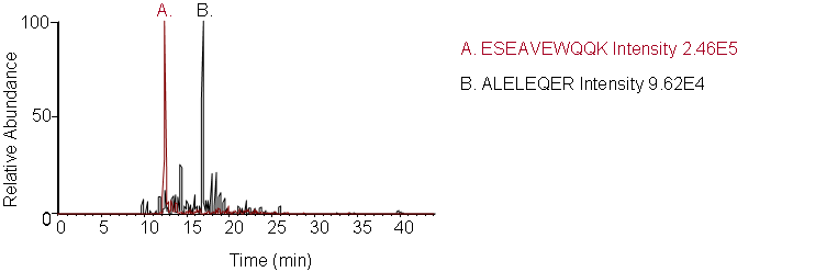 Peptides screening: Peptides were chosen in Skyline with preference given to tryptic sequences observed in the NIST Human LC-MS/MS library; for such peptides, the 5 most abundant y ions were automatically chosen. Additional peptides were chosen with preference given to sequences between 8 - 15 amino acids long, with no missed cleavages, and with no methionines. Fragment ions were chosen to represent the largest y ions, with attention to the presence of P, D, E, and H residues in the sequence.