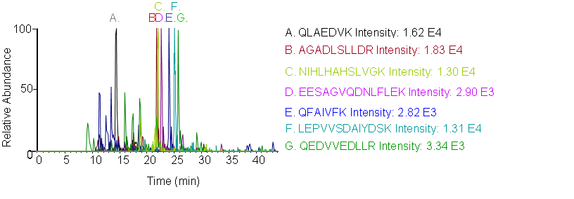 Peptides screening: Peptides and transitions for analysis were selected using a predictive peptide program. The results were screened for those with the highest specificity and the most intense transitions.