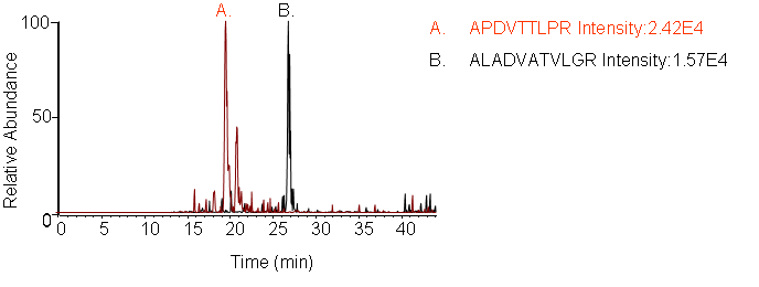 Peptides screening: Peptides and transitions for analysis were selected using a predictive peptide program. The results were screened for those with the highest specificity and the most intense transitions.