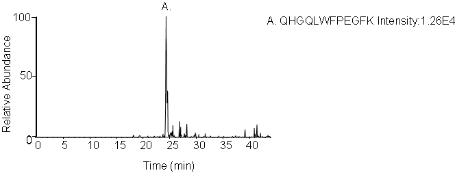 Peptides screening: Peptides and transitions for analysis were selected using a predictive peptide program. The results were screened for those with the highest specificity and the most intense transitions.