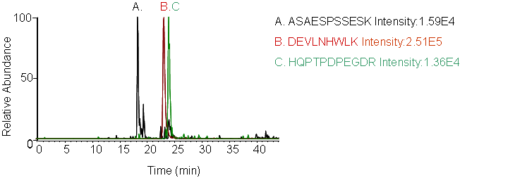 Peptides screening: Peptides and transitions for analysis were selected using a predictive peptide program. The results were screened for those with the highest specificity and the most intense transitions.