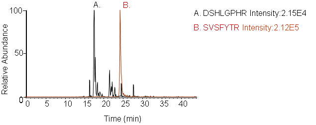 Peptides screening: Peptides and transitions for analysis were selected using a predictive peptide program. The results were screened for those with the highest specificity and the most intense transitions.