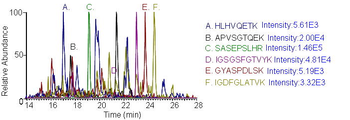 Peptides screening: Peptides and transitions for analysis were selected using a predictive peptide program. The results were screened for those with the highest specificity and the most intense transitions.