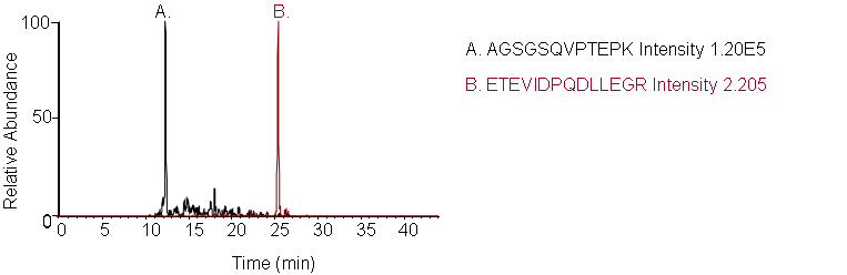 Peptides screening: Peptides were chosen in Skyline with preference given to tryptic sequences observed in the NIST Human LC-MS/MS library; for such peptides, the 5 most abundant y ions were automatically chosen. Additional peptides were chosen with preference given to sequences between 8 - 15 amino acids long, with no missed cleavages, and with no methionines. Fragment ions were chosen to represent the largest y ions, with attention to the presence of P, D, E, and H residues in the sequence.