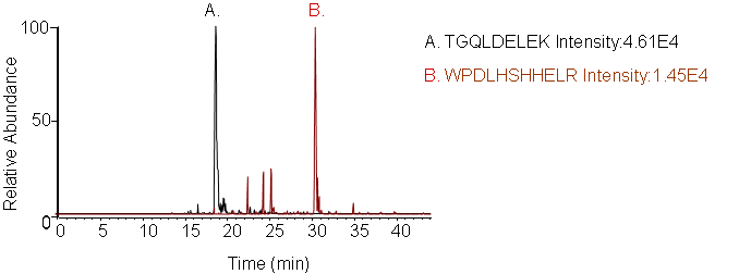 Peptides screening: Peptides and transitions for analysis were selected using a predictive peptide program. The results were screened for those with the highest specificity and the most intense transitions.