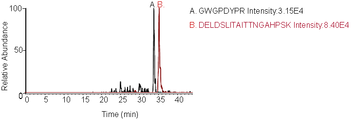 Peptides screening: Peptides and transitions for analysis were selected using a predictive peptide program. The results were screened for those with the highest specificity and the most intense transitions.
