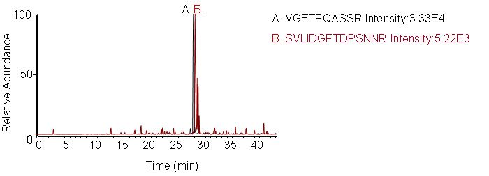 Peptides screening: Peptides and transitions for analysis were selected using a predictive peptide program. The results were screened for those with the highest specificity and the most intense transitions.
