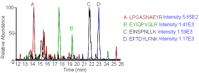 Peptides screening: Peptides and transitions for analysis were selected using a predictive peptide program. The results were screened for those with the highest specificity and the most intense transitions.