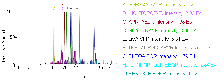 Peptides screening: Peptides and transitions for analysis were selected using both LC-MS/MS data and a predictive peptide program. The results were screened for those with the highest specificity and the most intense transitions.