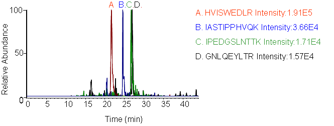 Peptides screening: Peptides and transitions for analysis were selected using a predictive peptide program. The results were screened for those with the highest specificity and the most intense transitions.