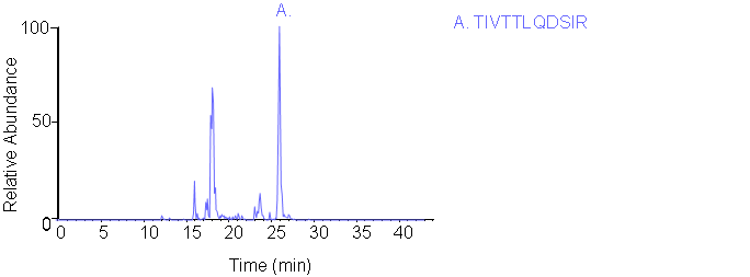 Peptides screening: Peptides were chosen in Skyline with preference given to tryptic sequences observed in the NIST Human LC-MS/MS library; for such peptides, the 5 most abundant y ions were automatically chosen. Additional peptides were chosen with preference given to sequences between 8 - 15 amino acids long, with no missed cleavages, and with no methionines. Fragment ions were chosen to represent the largest y ions, with attention to the presence of P, D, E, and H residues in the sequence.